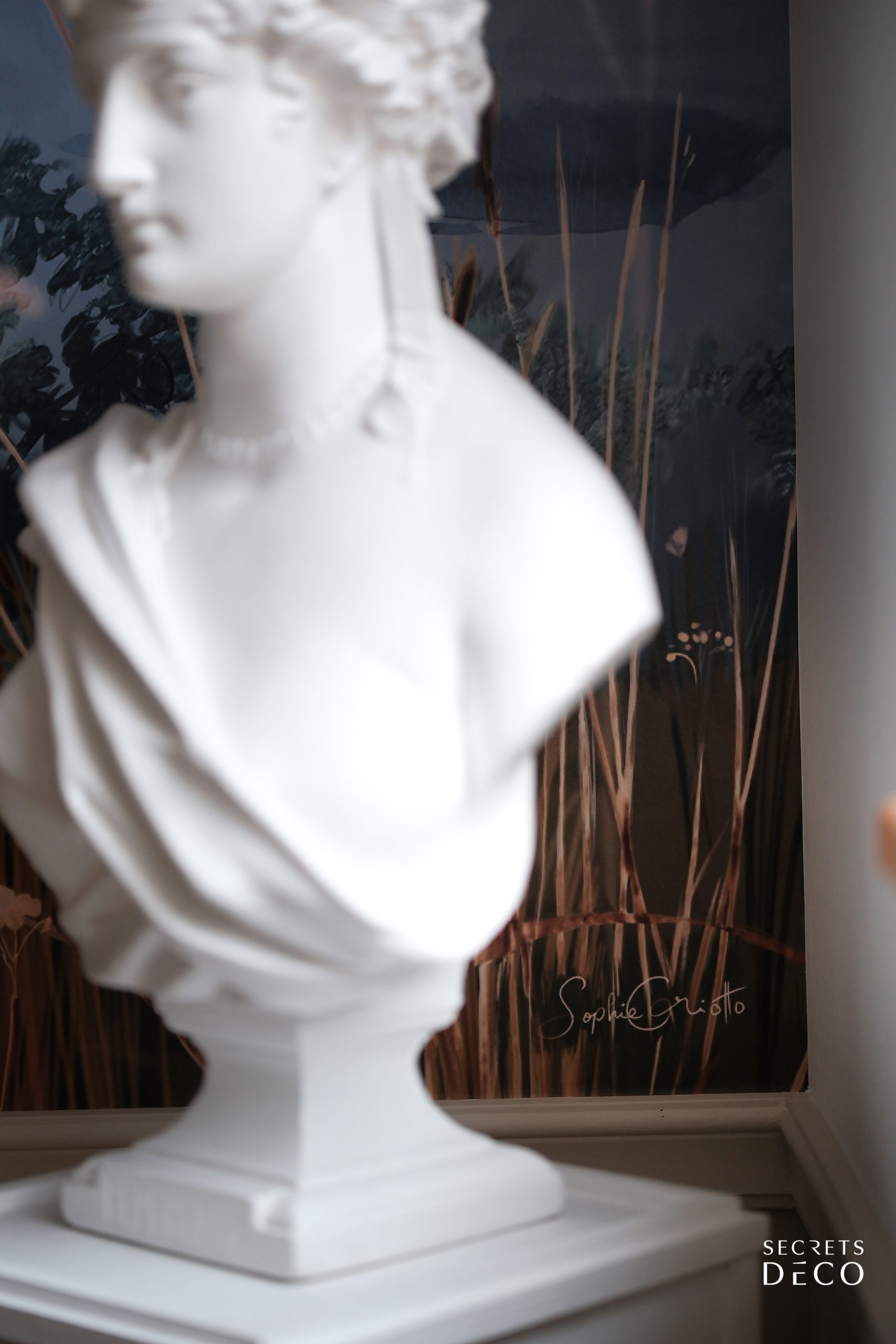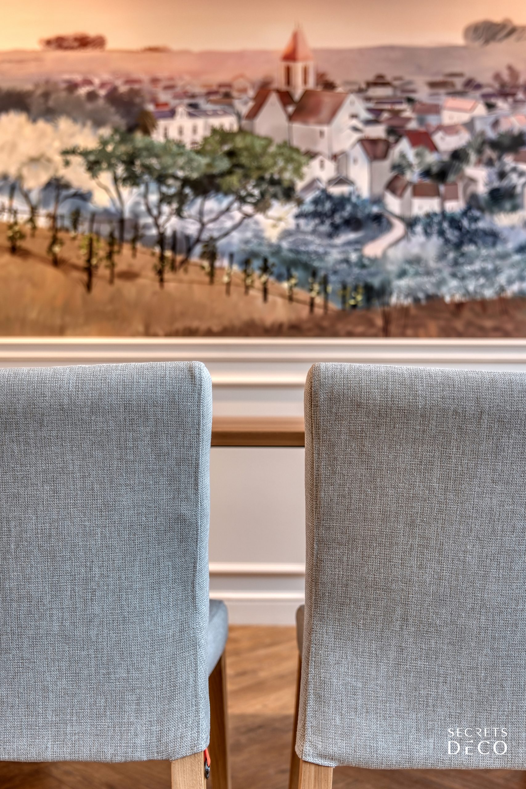 J’ai proposé d’habiller les murs de moulures en soubassement pour structurer l’espace, d’installer un grand papier panoramique pour créer un décor fort, et d’apporter une touche de bleu marine pour souligner l’élégance de l’ensemble. J’ai également conseillé la pose d’un sol effet bois en chevron, qui apporte chaleur et caractère. Enfin, j’ai suggéré d’inverser l’emplacement initial des deux salles afin d’améliorer leur fonctionnalité et d’optimiser leur usage.