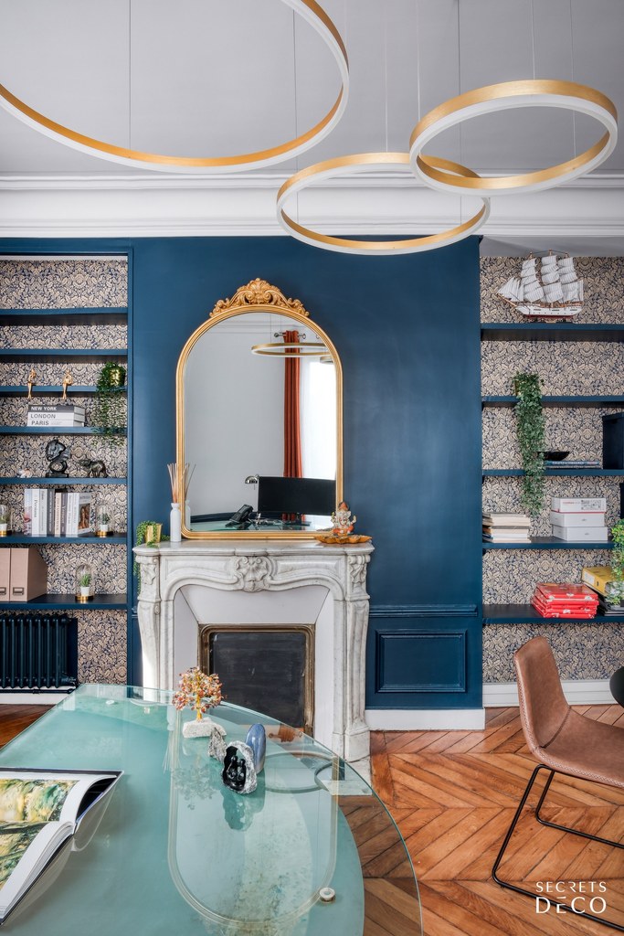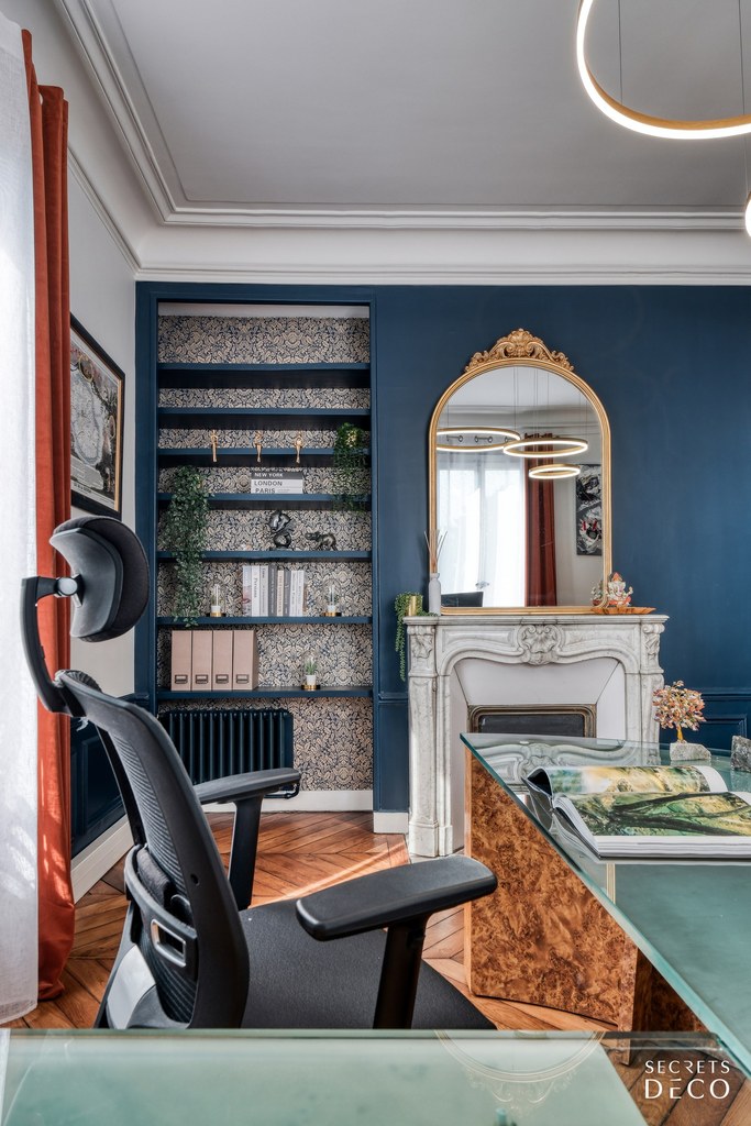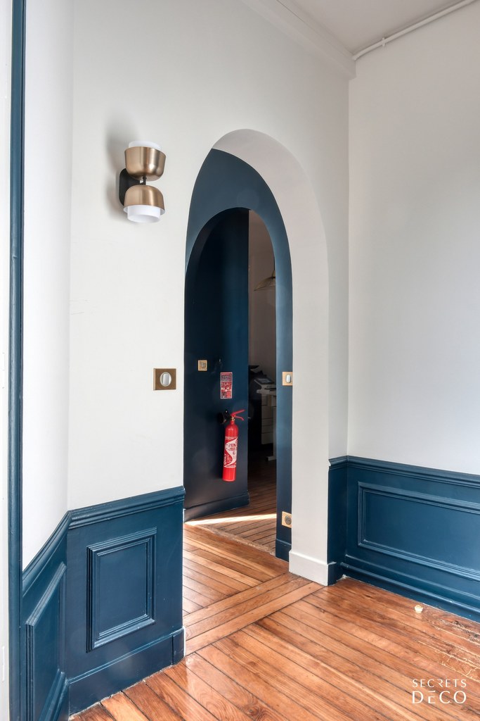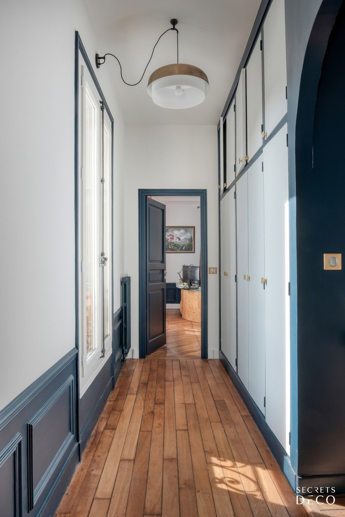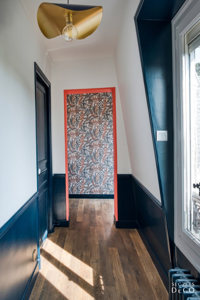 Le choix des couleurs a été guidé par la volonté de respecter le charme de la demeure tout en modernisant subtilement les espaces. Le bleu nuit s’invite sur les boiseries, les portes et certains éléments décoratifs, créant une atmosphère raffinée et intemporelle. Les murs ont été habillés de teintes claires pour optimiser la luminosité tout en mettant en valeur les éléments architecturaux d’origine.