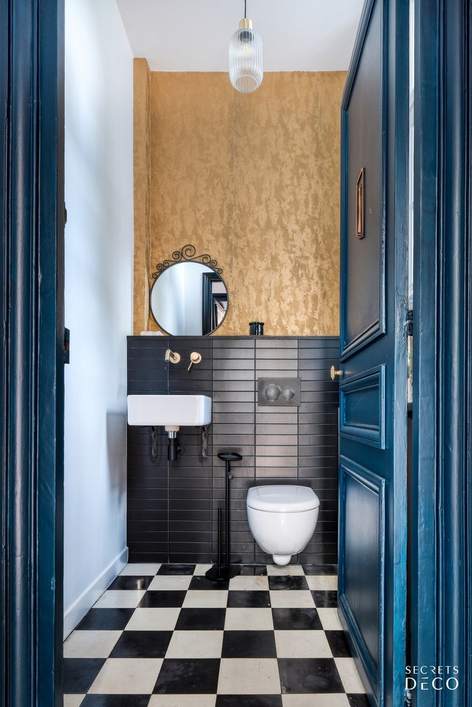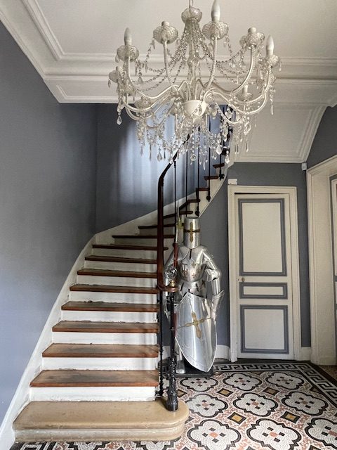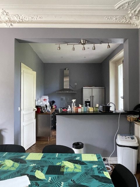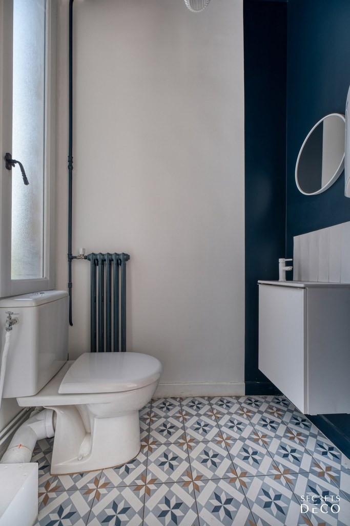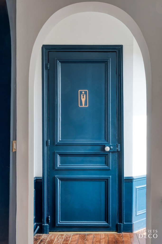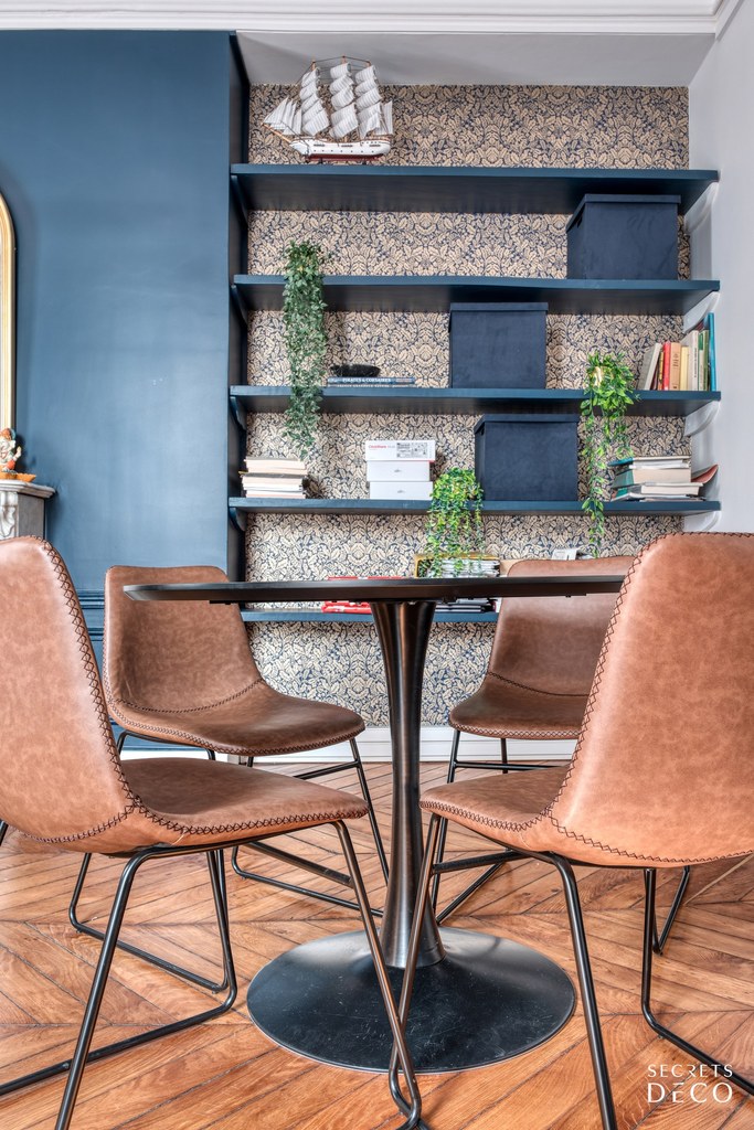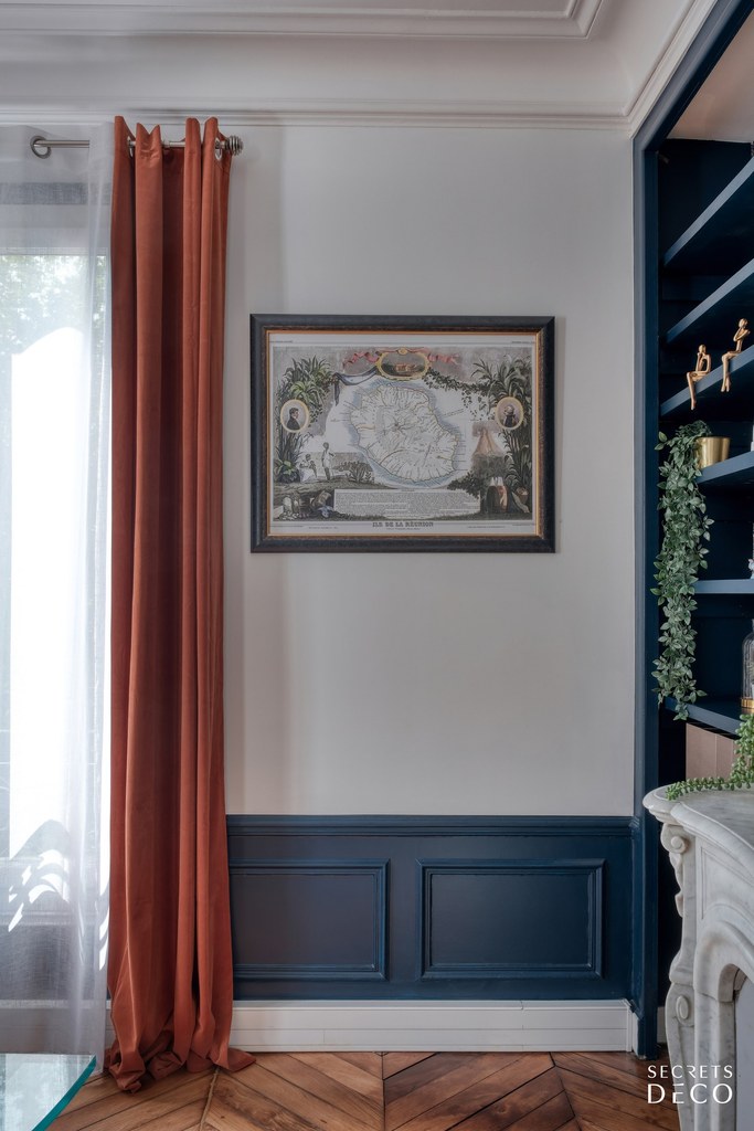 Le choix des couleurs a été guidé par la volonté de respecter le charme de la demeure tout en modernisant subtilement les espaces. Le bleu nuit s’invite sur les boiseries, les portes et certains éléments décoratifs, créant une atmosphère raffinée et intemporelle. Les murs ont été habillés de teintes claires pour optimiser la luminosité tout en mettant en valeur les éléments architecturaux d’origine.
