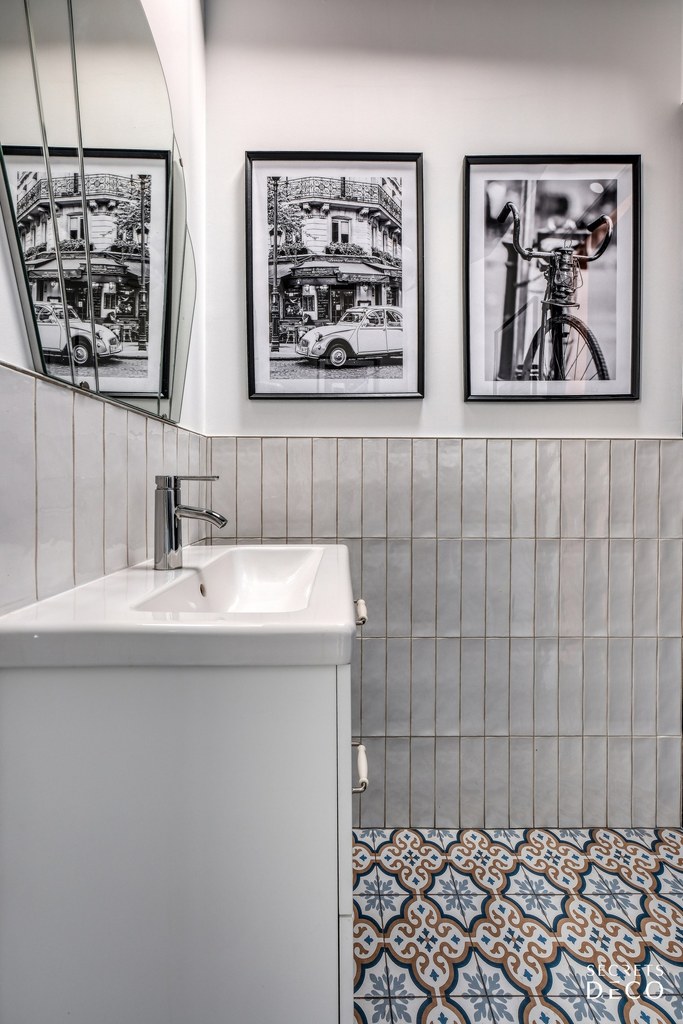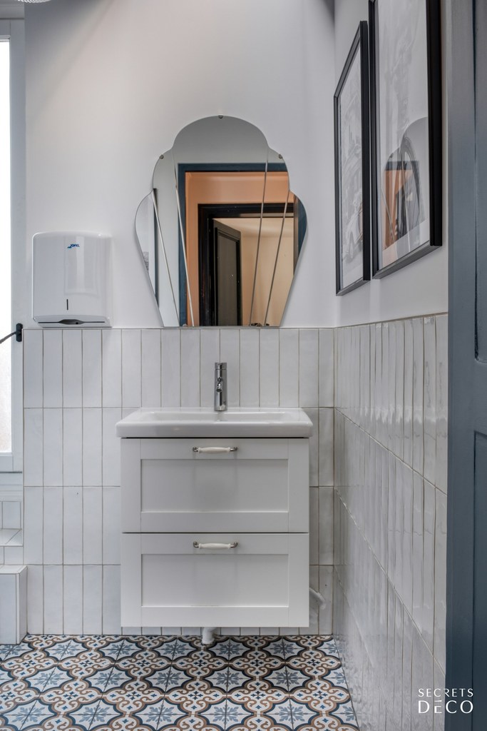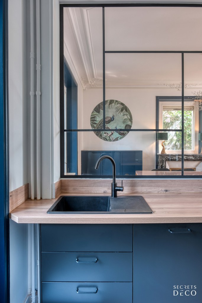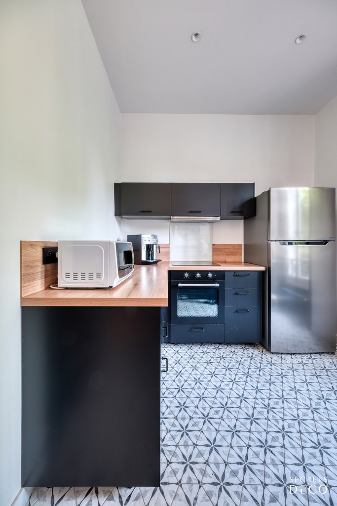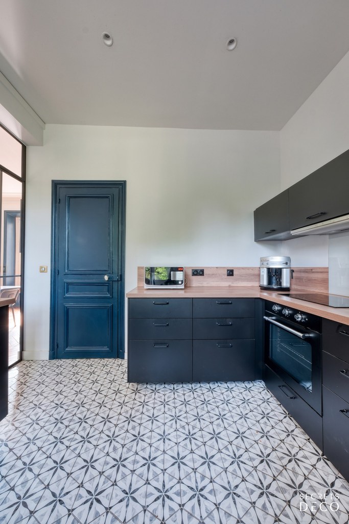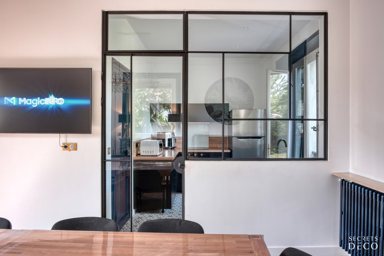 La cuisine a fait l’objet d’une rénovation complète. Les façades noires mates contrastent avec le plan de travail en bois, tandis qu’un carrelage graphique au sol vient rythmer l’espace. Une cloison verrière a été créée sur mesure pour séparer la cuisine du coin repas des collaborateurs tout en maintenant une grande luminosité naturelle.