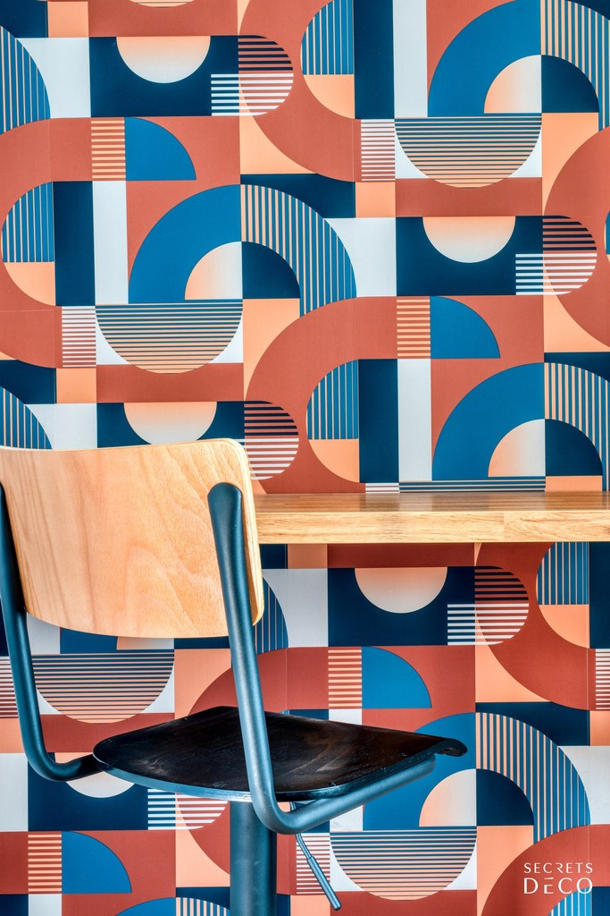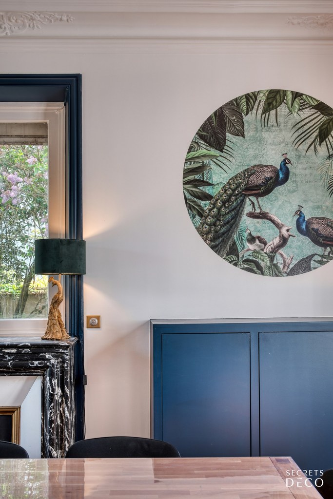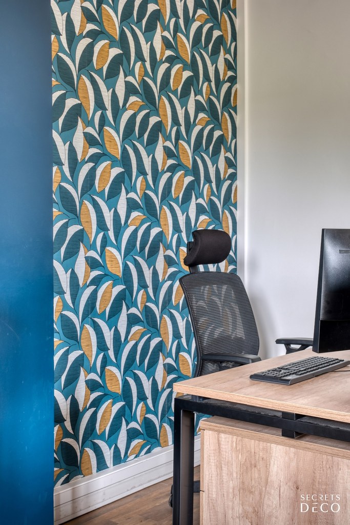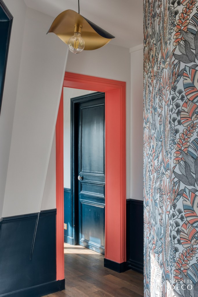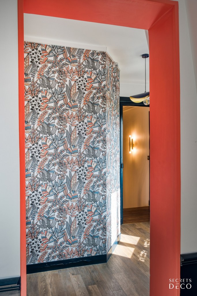 Les papiers peints ont été soigneusement choisis pour marquer chaque espace d’une signature visuelle forte. Le hall d’entrée se distingue par un somptueux papier peint panoramique représentant un paysage exotique, créant une ambiance immersive et captivante.