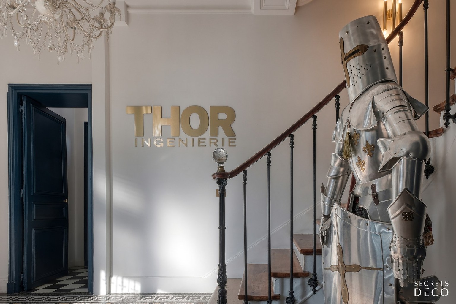 L’accueil est marqué par la présence du logo « Thor Ingénierie » en lettres dorées, un élément imposant et structurant qui rappelle l’identité de l’entreprise tout en s’intégrant harmonieusement au décor. Les touches dorées se retrouvent également dans les interrupteurs et certains luminaires, créant une continuité visuelle subtile.