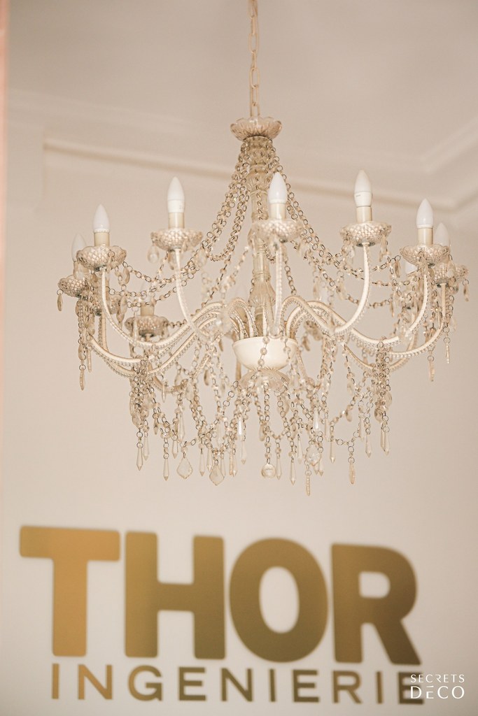 L’éclairage a été minutieusement étudié pour chaque pièce. Dans les bureaux, des appliques dorées diffusent une lumière douce. Et ce magnifique lustre à pampilles en verre facetté apporte une touche théâtrale et précieuse à l’accueil, contrastant avec le logo doré « Thor Ingénierie ».